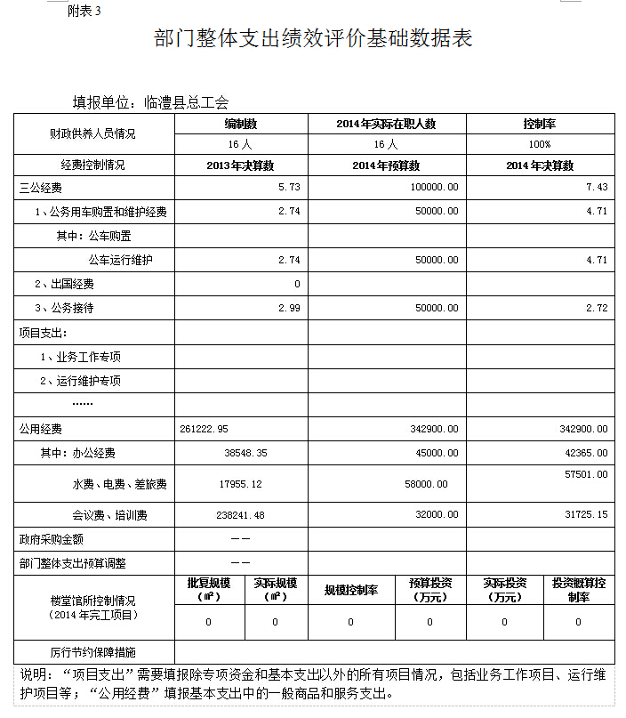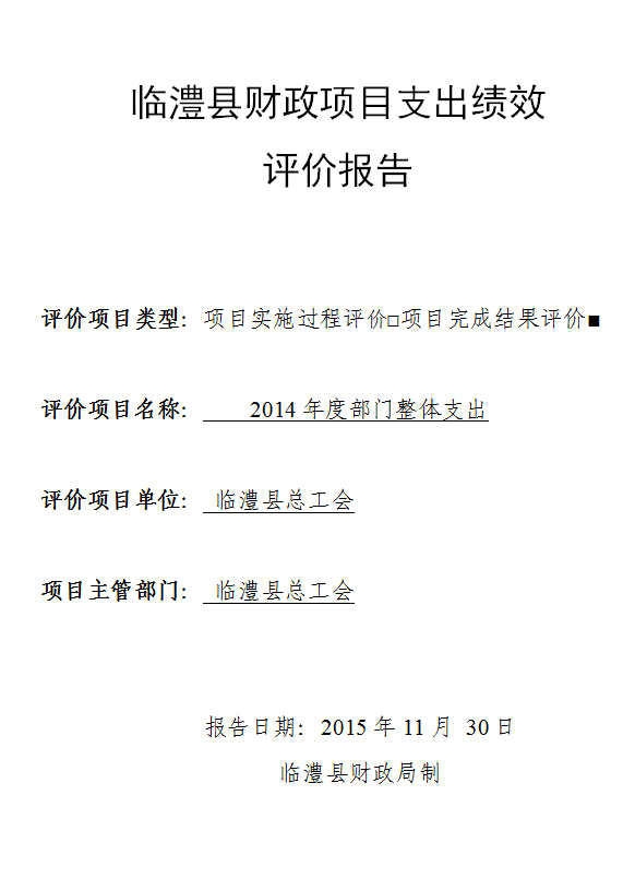 根据《临澧县财政局关于做好2014年度部门整体支出绩效自评工作的通知》(临财绩〔2015〕1号),县工会成立了以本单位主要负责人为组长的绩效评价工作组,制定了评价工作方案,采取座谈等方式听取情况,检查基本支出、项目支出有关账目,收集整理支出相关资料,并根据材料进行分析,形成自评结论。