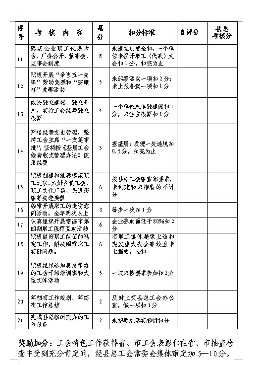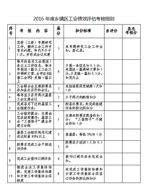 《2016年度乡镇区工会绩效评估考核细则》,已经县总工会常委会讨论通过,现印发给你们。请严格按照《细则》内容,认真抓好各项工作任务落实。县直单位工会联合会参照本《细则》考核。